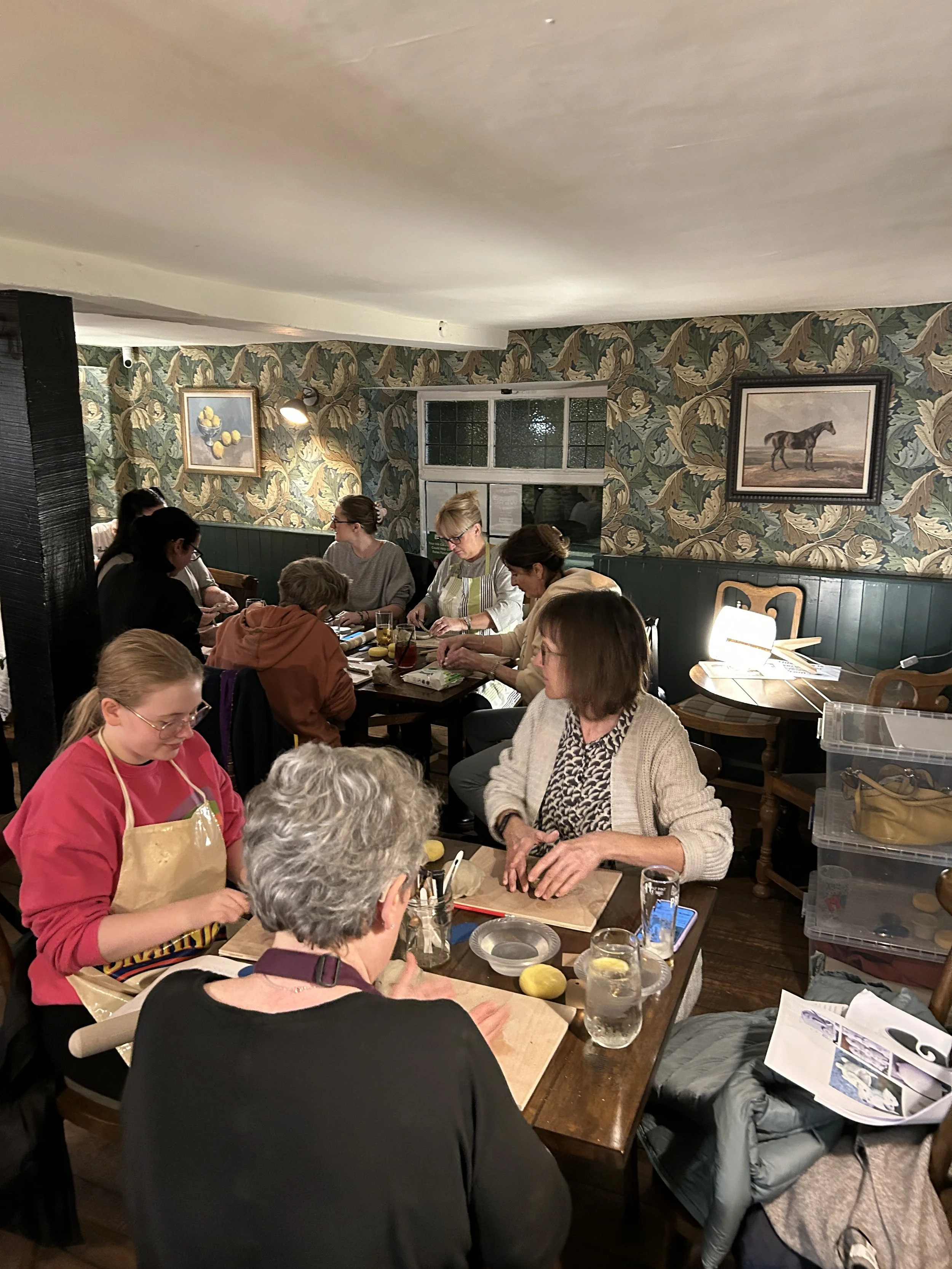One of the most enjoyable ways I’ve been able to bring pottery into the community has been through Pottery at the Pub. These evenings are relaxed, creative, and social. You’ll find yourself seated in the welcoming atmosphere of a local Oxfordshire pub, perhaps with a glass of wine, beer, or even just a soft drink by your side, as you shape and mould clay into something uniquely your own.